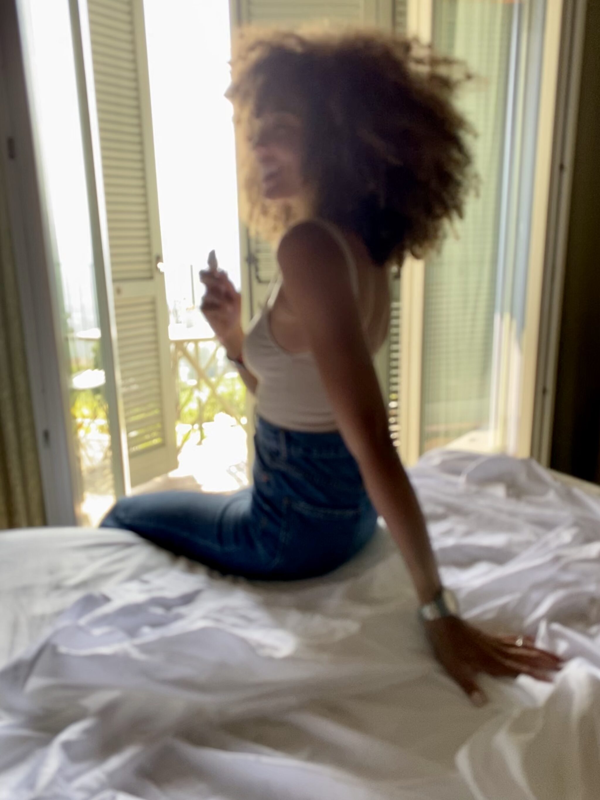 Je continue de peigner mes cheveux avec mes doigts, en veillant à ne pas défaire les boucles (il faut qu’elles restent quand même assez bien « regroupées » entre elles, vous voyez l’idée ?).